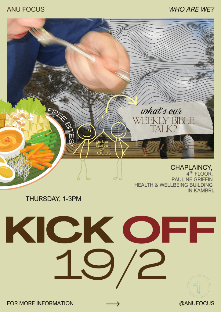 Chaplaincy, from 1-3pm. Get a taste of what our Weekly Bible Talks are like and meet students across FOCUS – all with a free meal to top it off!